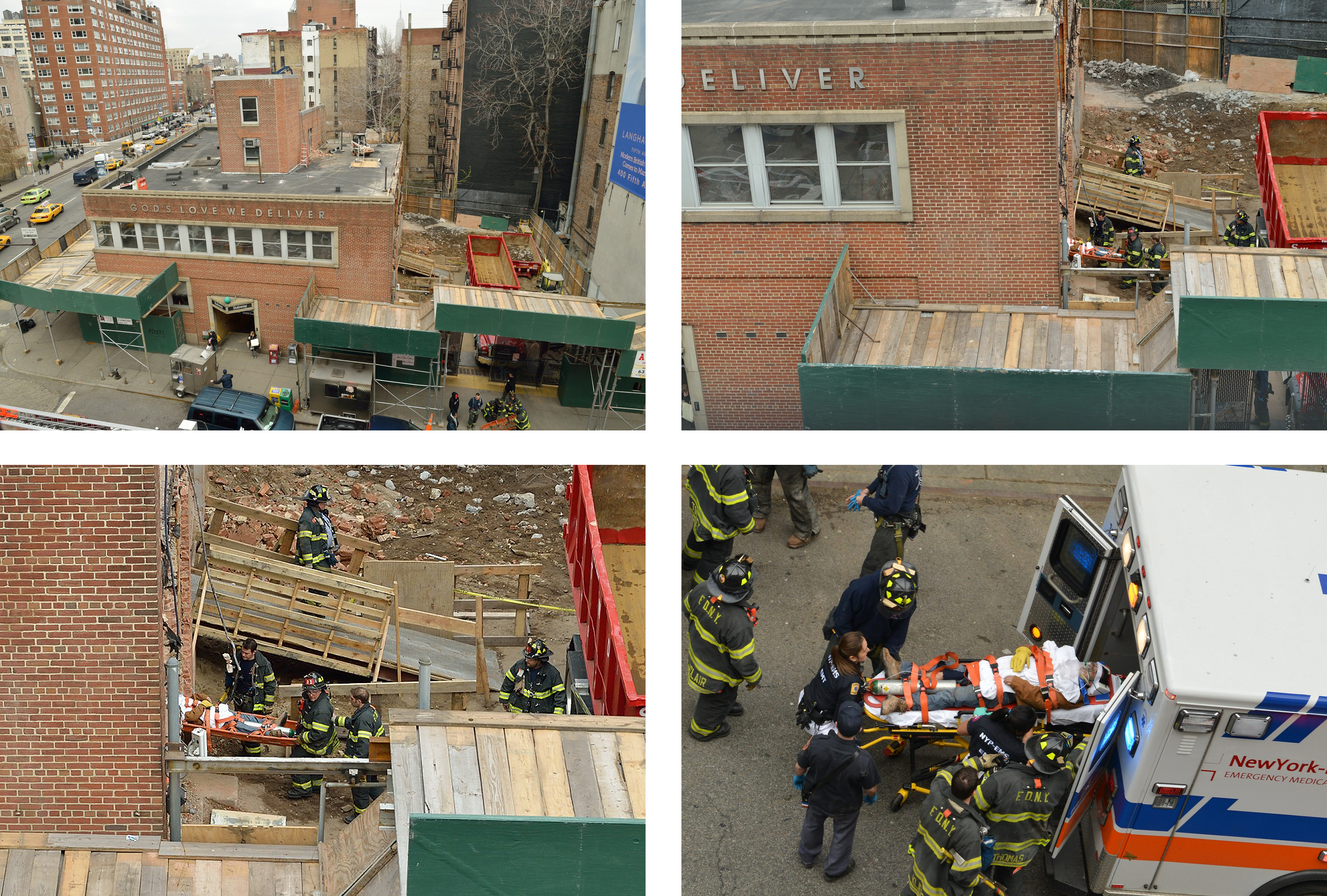 In addition to delivering a luxury condo construction site to our formerly quiet neighborhood, God’s Love We Deliver is now in the business of delivering unsafe working conditions. At about 1:00 Thursday afternoon, there was an accident at the God’s Love We Deliver site, and a worker was removed on a stretcher. We don’t know if there is a stop work order, but these images suggest that there ought to be. The Spring Street subway entrance is completely exposed to heavy demolition work on the roof of the former God’s Love We Deliver building. This work includes the jackhammering demolition of brick walls. There is no scaffolding or protection for straphangers entering or exiting the station, or for the local food cart vendor.