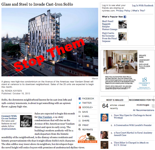 Our fight against the GLWD-QT development at 180 Sixth Avenue has been much in the news in the past year. The New York Times covered our challenge as early as May, with a report on the fight by journalist Ronda Kaysen (5/7/13). Not long after that, in mid-July, the Times reported on the development assaults to our neighborhood in a report by John Freeman Gill (8/13/13). And even the Times’ Real Estate section (10/20/13) — never known to frown on new luxury development — characterized the QT project as an “invasion”. Starting in January and throughout the year, we’ve had excellent coverage from The Villager. And, of course, the dangerous conditions at the building site were widely covered in late September, when 188 Sixth Avenue had to be evacuated due to hazardous conditions created by QT’s excavation work. We expect our legal challenge to be much in the news in 2014. Stay tuned.