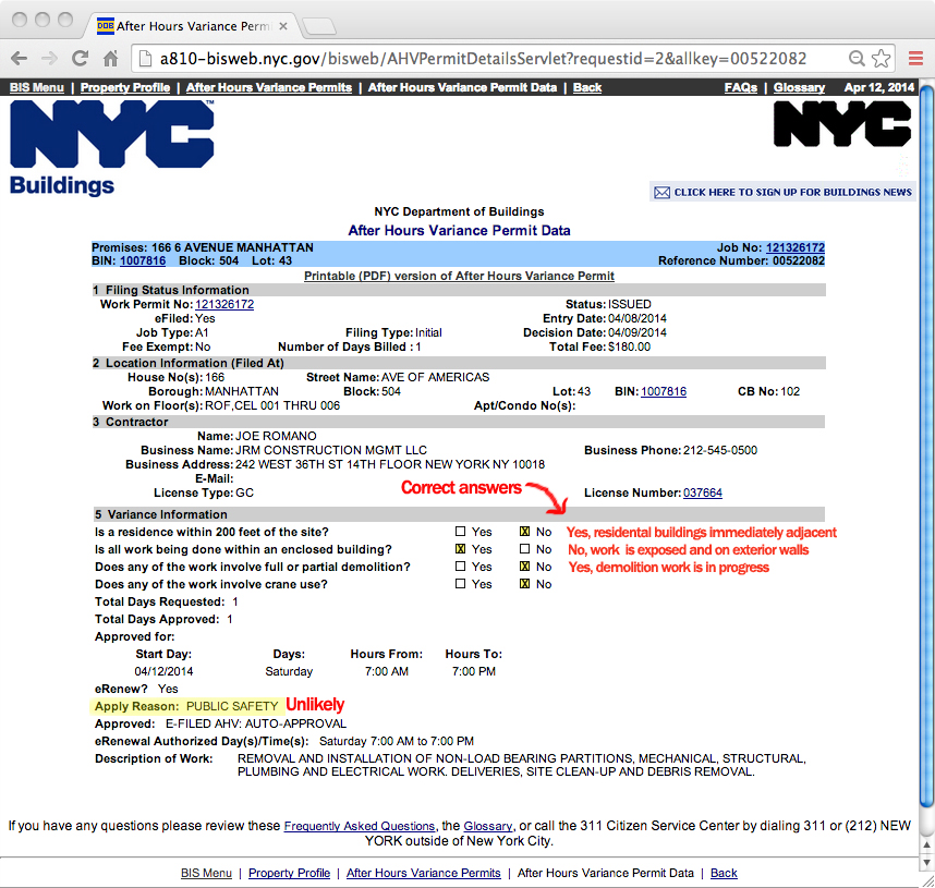 You may refer to the publicly-accessible information here in case you are thinking of disputing it. Or you can view the annotated image of your contractor’s application for after hours work permits, which includes corrected answers for your reference.